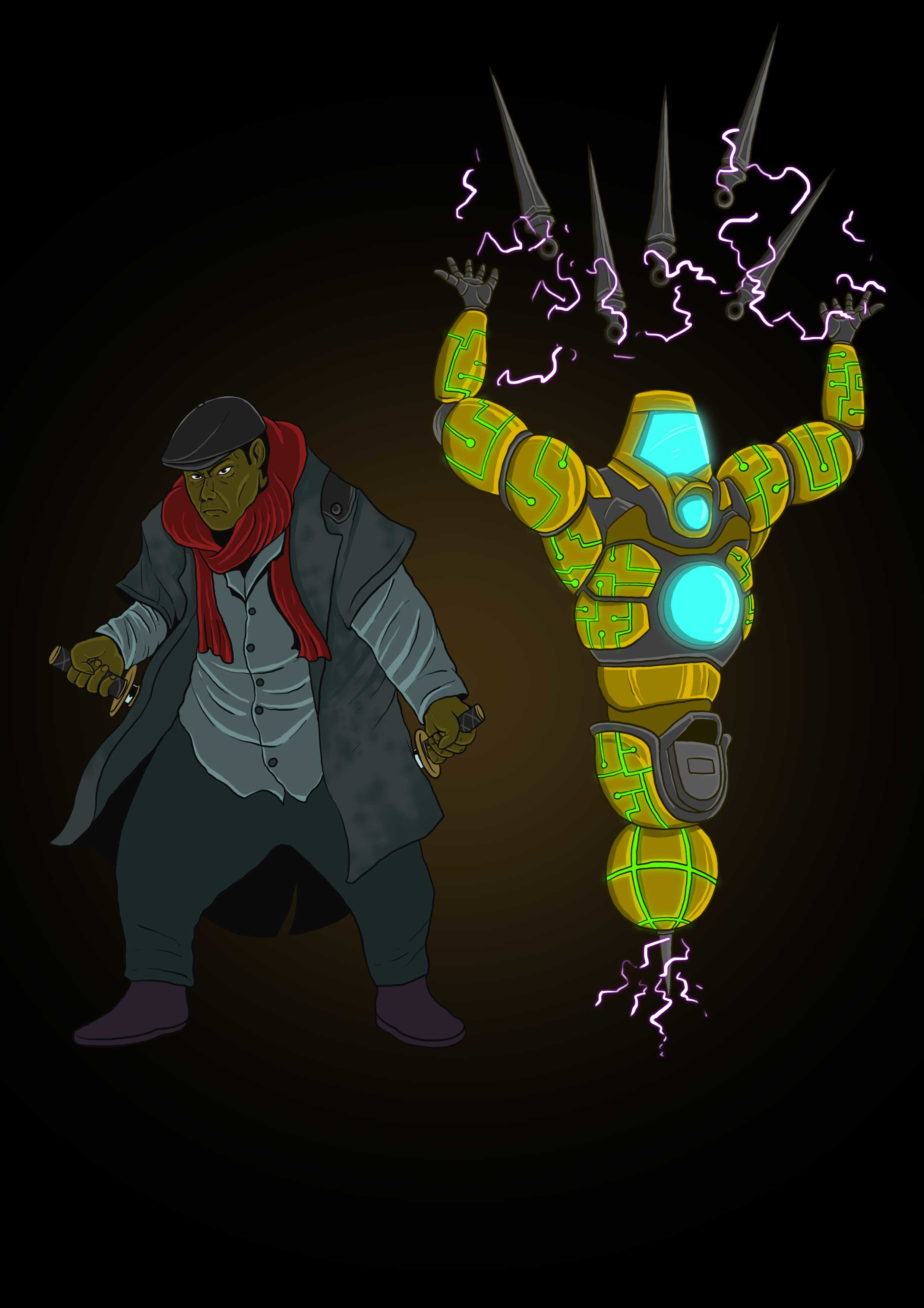 Greg Farran’s summoned ally is, itself, an impressive sight to behold. Lovingly referred to as Sparky around Greg Farran’s shop, this bot is reconstructed by Farran’s magic every time it is summoned. The robot watches its master’s back, and occasionally joins him in wielding a series of sharp swords created by its own metal manipulation abilities. These blades either dance through the air to strike an opponent from a distance, or stay in the robot’s hands to be used the old-fashioned way. Sparky summons its blades from a fine, metallic dust which surrounds it. Energy traces through the near-invisible cloud to keep it close and controlled, and that energy creates occasional sparks which are the robots namesake.