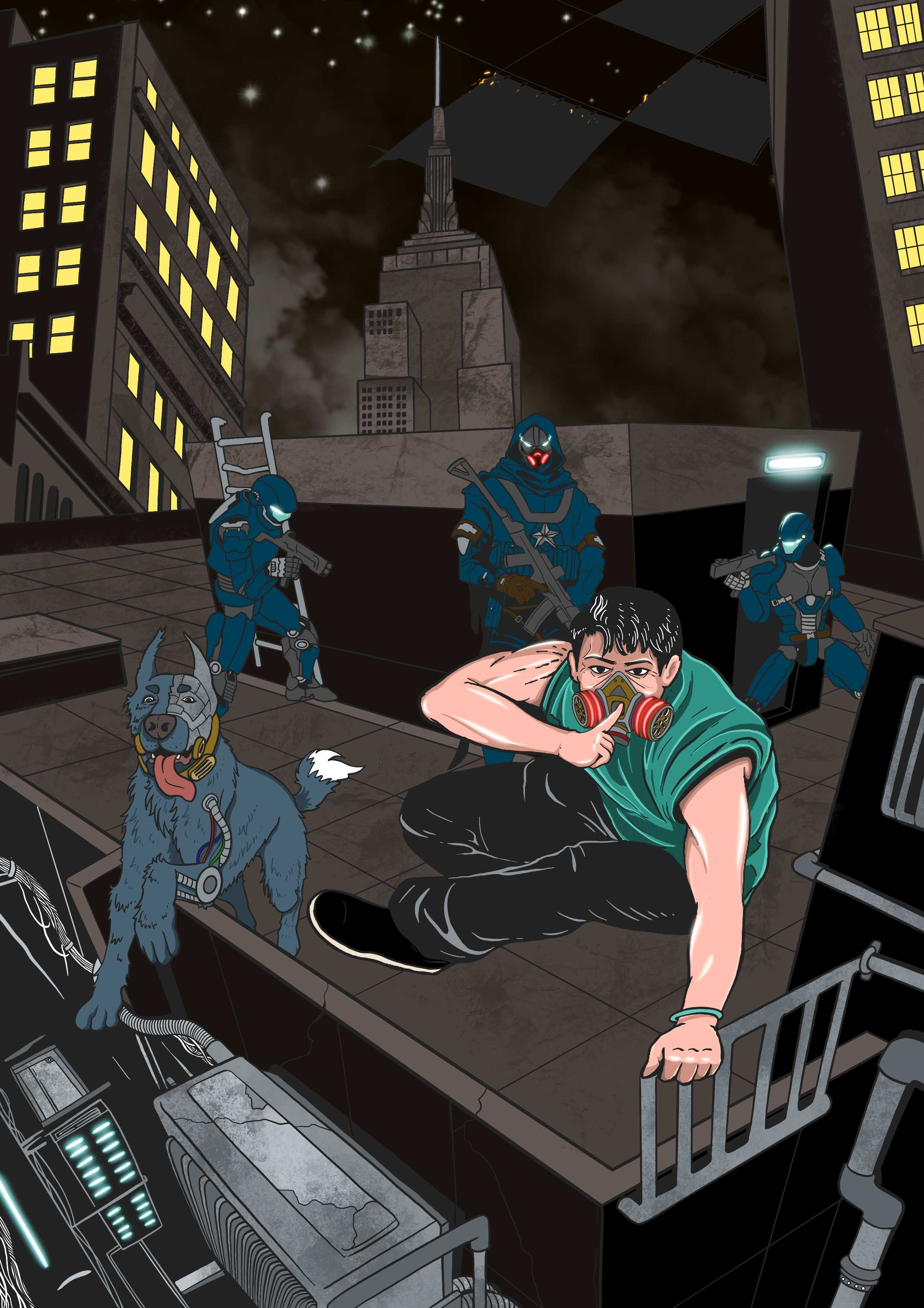 So this will be Everett and his dog his dog. When I told my artist that he should be running from the police I thought the police's heads would be on the other side of that block and not in front of it but oh well it's a good picture